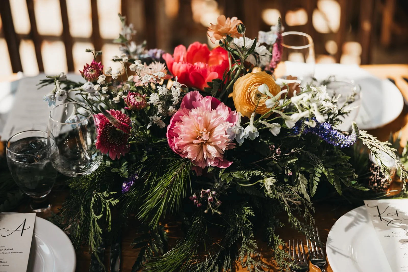 Pine and cedar garlands paired with local Sierra Nevada blooms decorated rustic wooden tables.