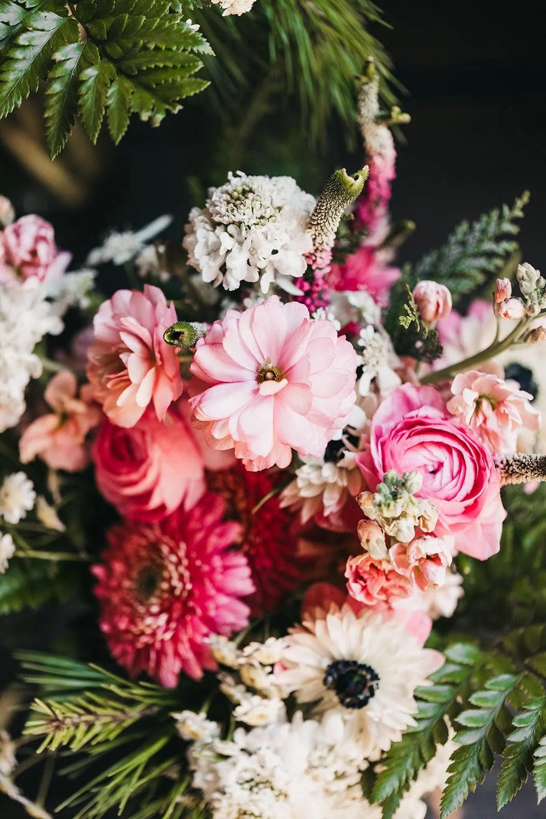 Their bouquets were pine and cedar with wildflowers of their dress color.