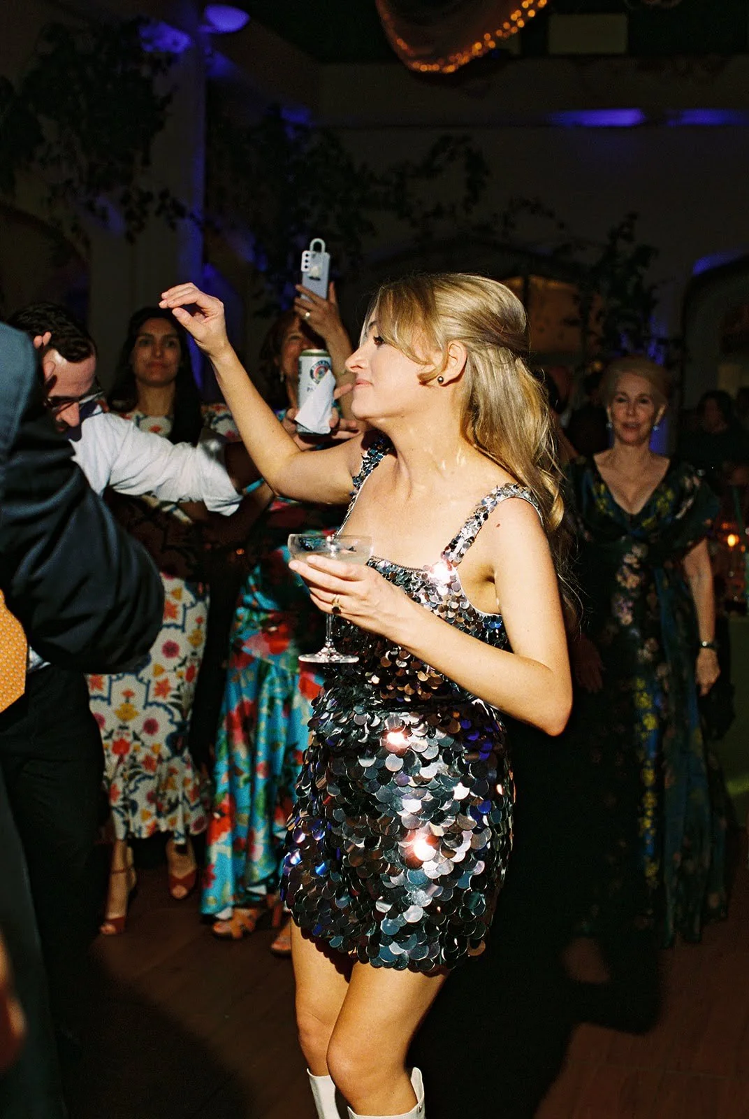 Samantha’s afterparty look was entirely DIY, a full-sequin dress she built herself. The dress was inspired by a vintage photograph she found of a sixties woman with big blonde hair.