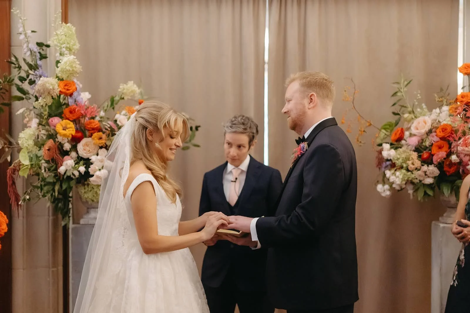 Samantha brought Nathalie a manila veil from the 70s worn by her mother-in-law, who just celebrated a 50-year anniversary. They considered adding lace from the gown but chose to keep it as is. Wearing it was “sort of a game day decision” and it paired beautifully with the gown.